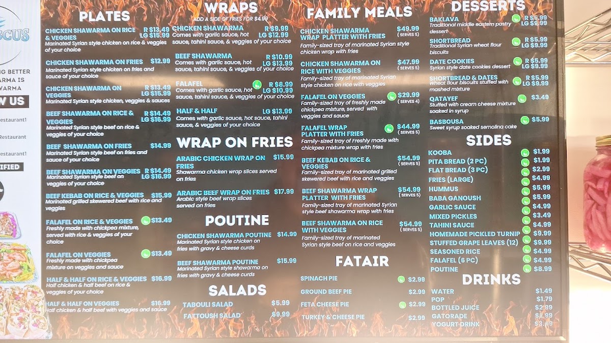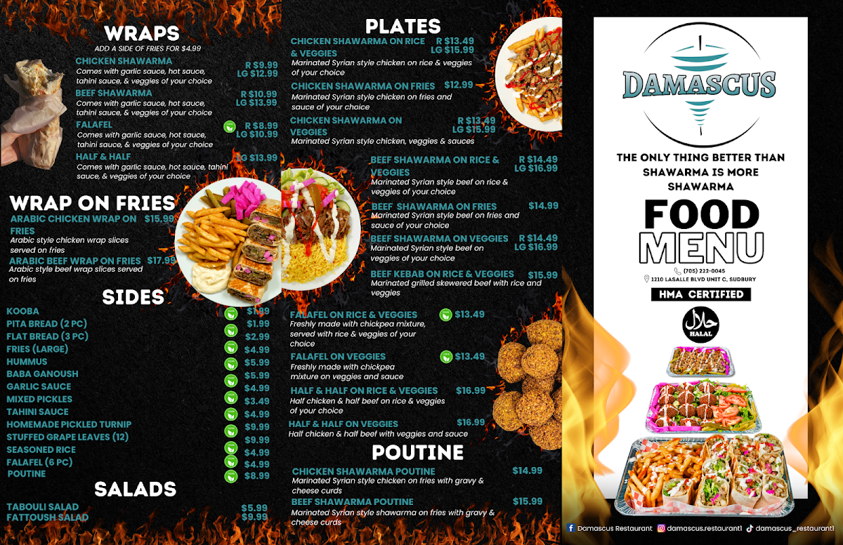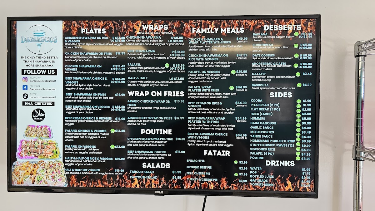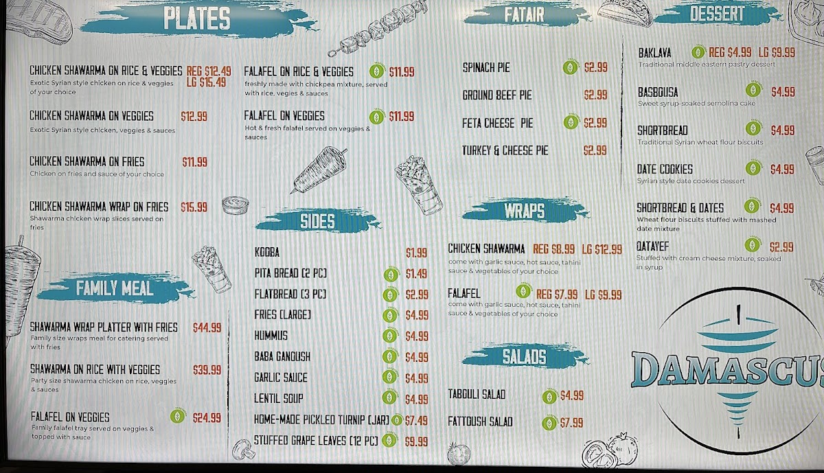 Damascus Shawarma offers a straightforward, approachable menu focused on classic Syrian and Middle Eastern flavors served in a casual setting. The selection includes a variety of wraps, hearty plates, and refreshing drinks that make it an easy choice for a relaxed lunch, a quick dinner, or a comfortable family meal.